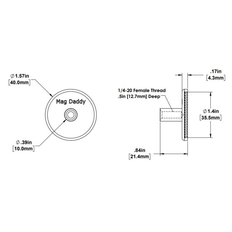The Mag Daddy 1/4"-20 Female Threaded Magnet Mount is a robust and versatile solution for securely mounting equipment in various applications. Featuring a powerful neodymium magnet with an impressive 40 kg pull strength, this mount ensures a firm hold on ferrous surfaces without the need for drilling or adhesives.